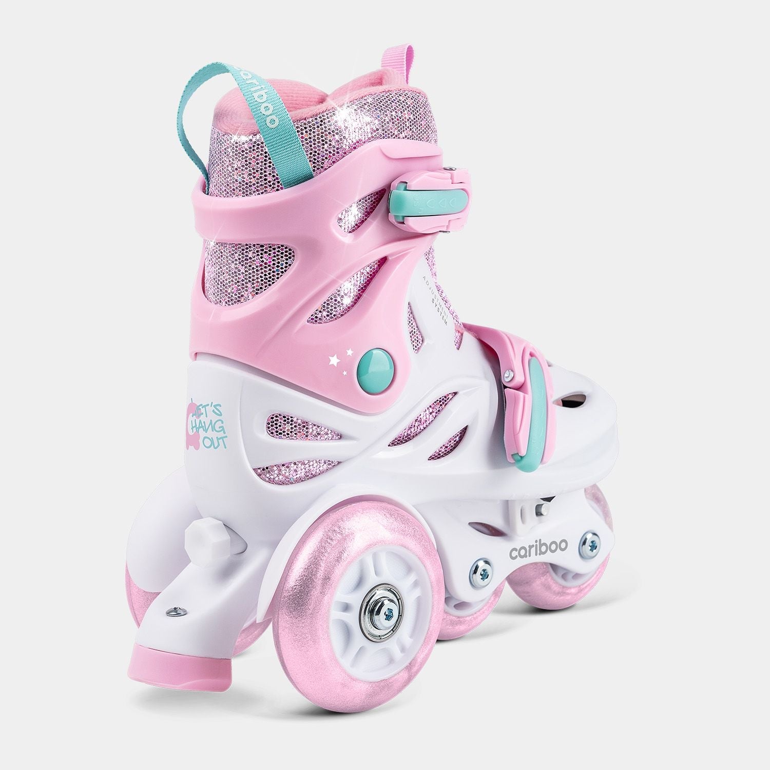 The Ballerina inline skates from Cariboo are designed to help children take their first steps in skating. The special construction ensures stability and makes it very easy to maintain balance. The skates feature two smaller front wheels arranged like in classic inline skates, and two larger rear wheels positioned like in traditional roller skates. This design guarantees a safe and enjoyable start.
