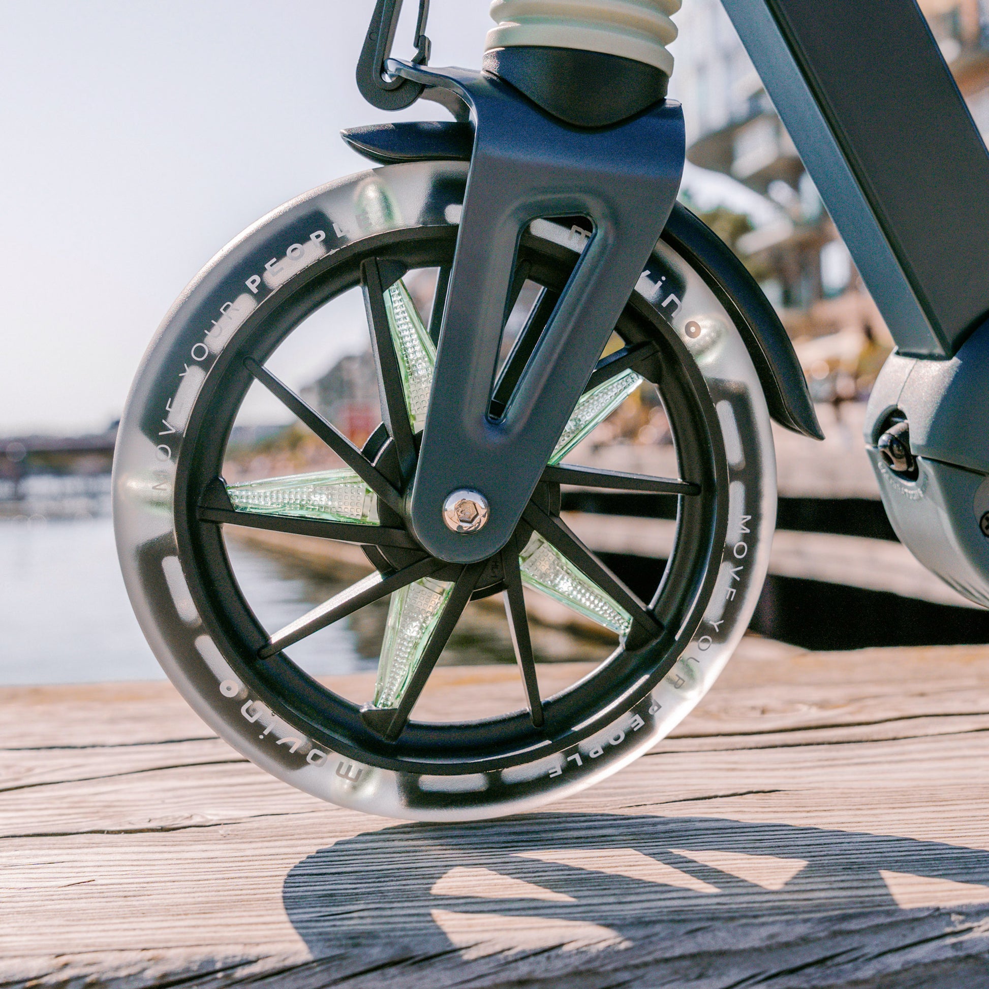 Double LEDs in the core and PU layer light up every wheel rotation. The faster the ride, the stronger the lighting effect, visible from afar. The Movino City Light looks spectacular and increases safety after dark.
