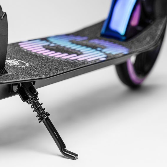 El Infinity Rainbow cuenta con ruedas y cinta de agarre de colores arcoíris. El freno y la horquilla en acabado neón convierten a este patinete en algo más que un medio de transporte: es un accesorio elegante que te hará destacar en la calle.