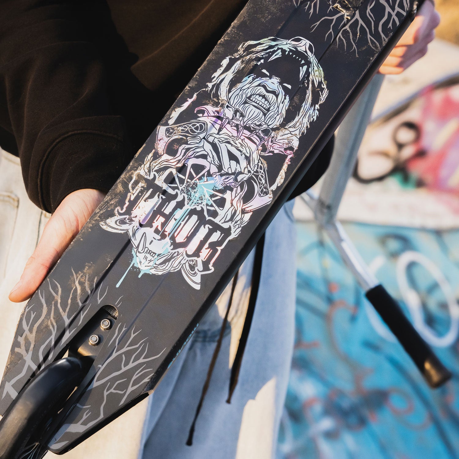 El nuevo Thor ha recibido un deck mejorado que es aún más resistente y destaca por su estilo. Un poco más ligero, con una longitud de 48 cm y un ancho de 12 cm, fabricado con aluminio de alta calidad y cortado en forma peg-cut, te ayudará a superar cualquier obstáculo en el skatepark. Para reforzar su estructura, hemos incorporado un corte especial en la parte inferior. Gracias a los cambios introducidos, el patinete ha ganado en ligereza (pesa 3,3 kg) sin perder nada de su resistencia y solidez.
