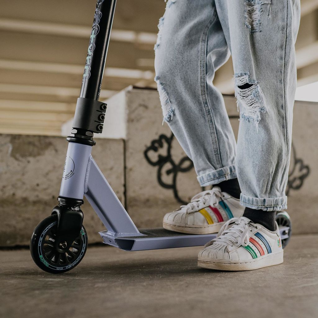 El primer patinete stunt de un niño debe destacar por su versatilidad, tamaño y, como en Movino creemos, ¡calidad! El modelo Tyro está equipado con ruedas de núcleo de nylon de 100 mm de diámetro, un sistema de compresión roscado y una plataforma de aluminio, manteniendo todo el conjunto por debajo de los 2,9 kg. Es un patinete ligero y resistente que abrirá a los riders principiantes un mundo de trucos en el skatepark y en la calle.