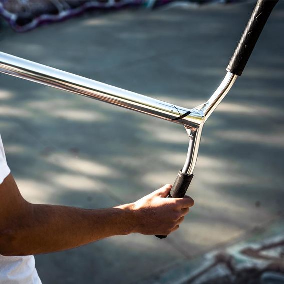 Gracias a nuestra colaboración con los riders del Movino Team, refinamos continuamente nuestros scooters para satisfacer las necesidades de los usuarios. El nuevo Movino X-Core cuenta con una plataforma y un manillar más cortos, lo que lo hace aún más ligero (3,2 kg). Este scooter ligero pero altamente resistente te permite realizar trucos complejos en el skatepark.
